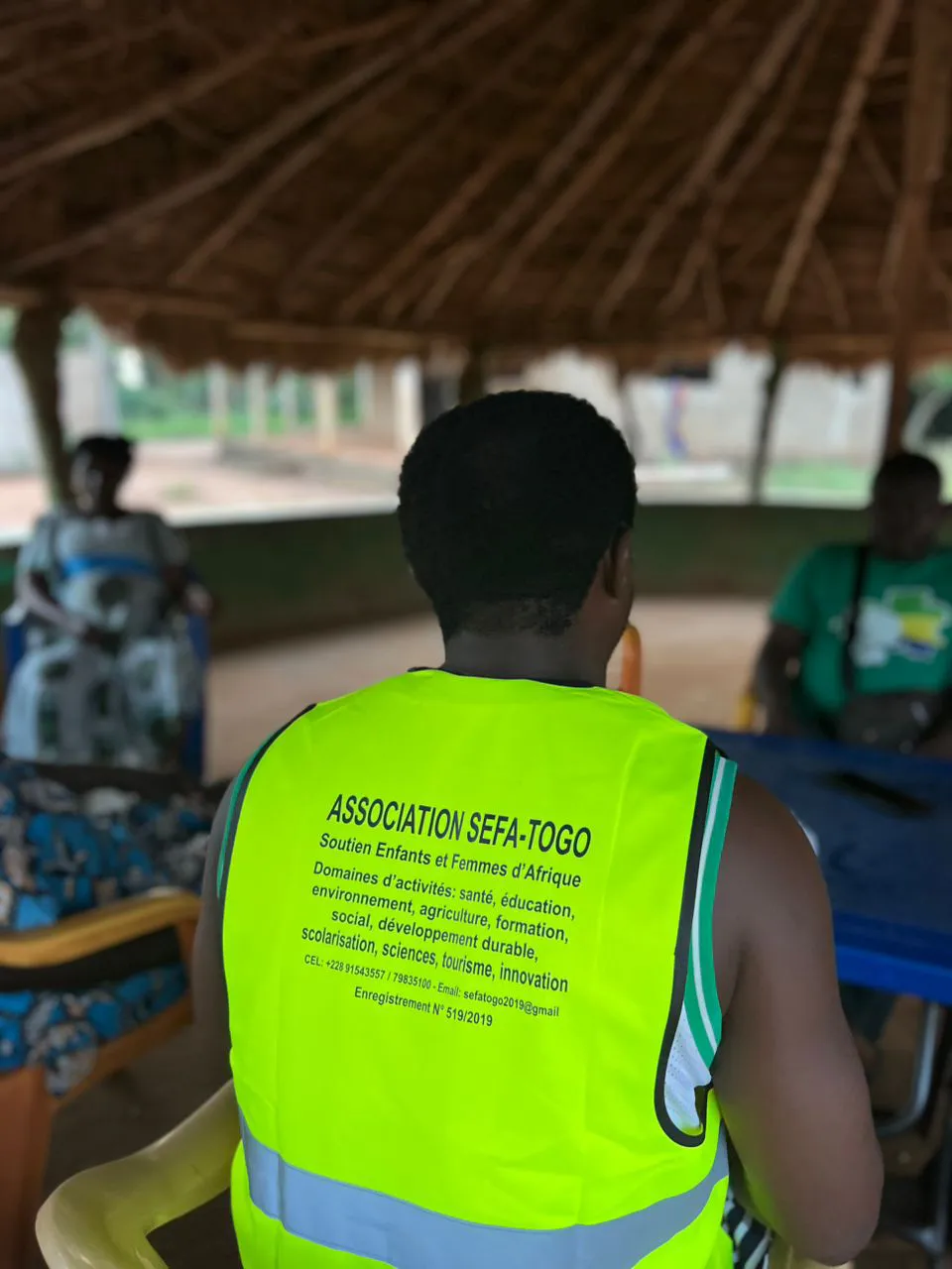 Sur les photos, vous pouvez voir la machine nouvellement acquise, ainsi que des représentants de la communauté villageoise de Kovié avec l’équipe de SEFA-Togo et la réunion dans la salle commune.